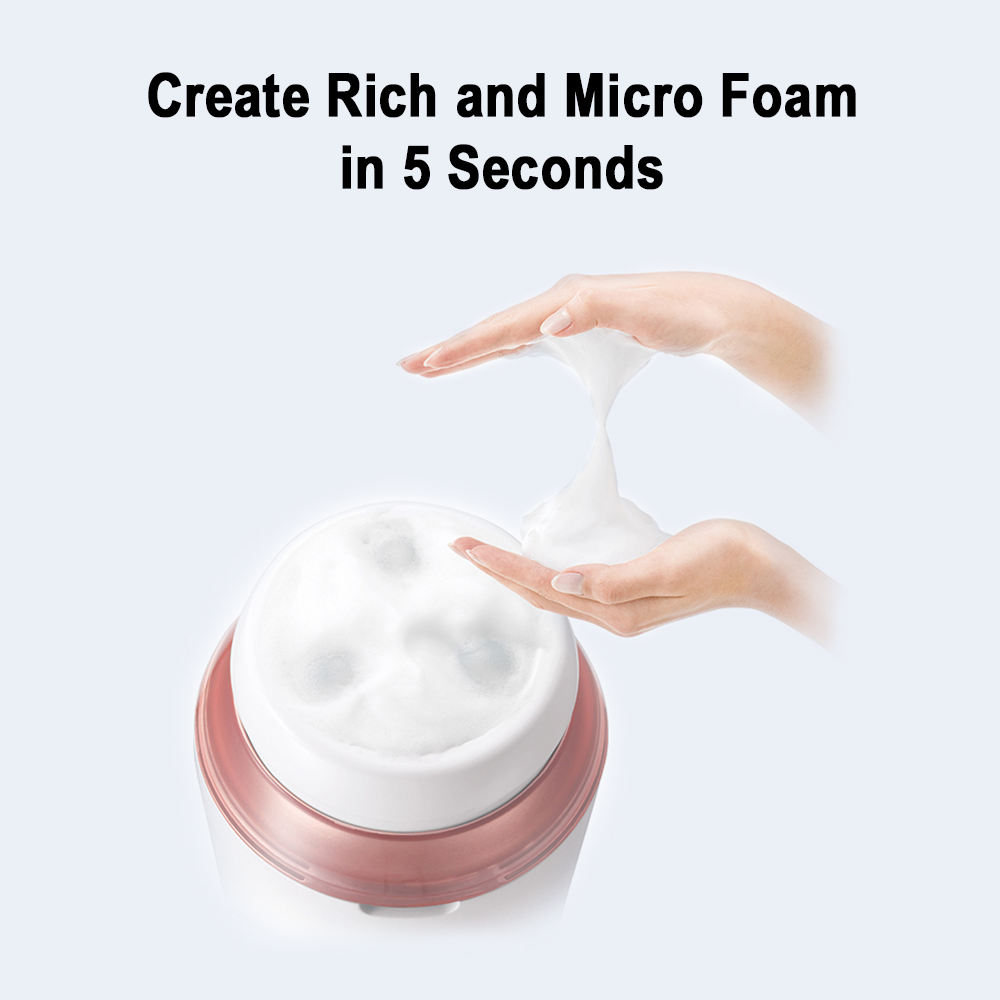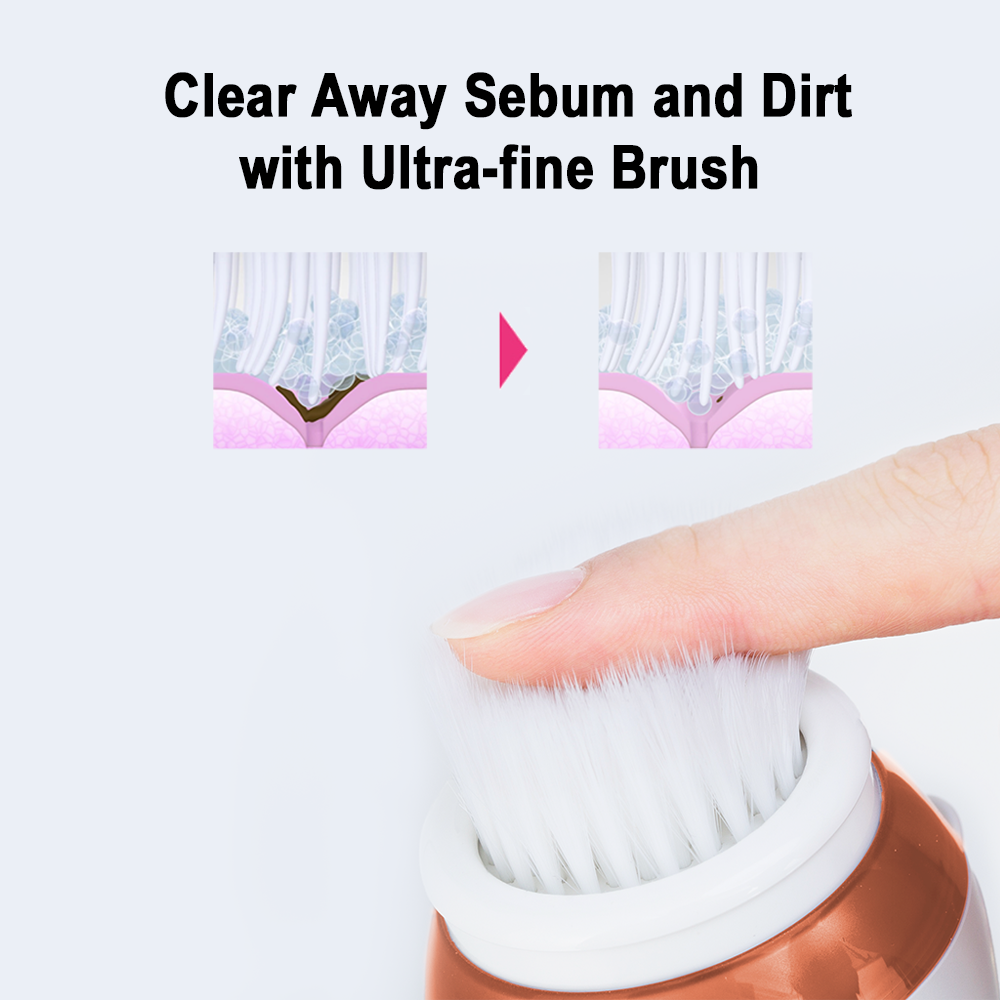 Micro-foaming facial cleansing and massage device with warm makeup-removal plate and multiple brush attachments.